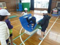 今日(3月4日)、3年生は体育で台上前転に挑戦しました。