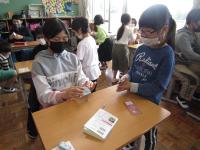 卒業まであと8日と迫った6年生へ、一年間お世話になったお礼にと、1年生から「ぴょんぴょんガエル」のおもちゃがプレゼントされました。