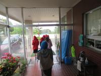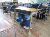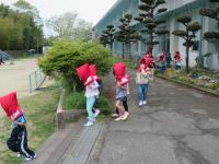 子供たちは、放送の合図で机の下に避難。そして、防災頭巾で頭部を保護し、安全を確認しながら、各担任の誘導でスムーズに運動場へ避難することができました。