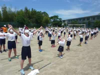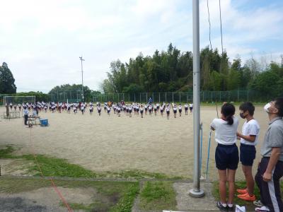 今日(5月19日)の4時間目、みんなの願いが通じたのか、雨があがって初めての全体練習を行うことができました。