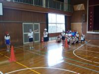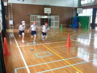 体育館なので全力では走れませんが、ついつい力が入ってしまします。走った後は、着順に整列します。走る人を拍手で応援することも大切です。