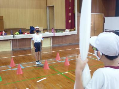 今日(5月21日)、雨は降っていないものの、昨日の大雨で運動場が使えません。そこで、4年生は体育館でできる練習として、徒走の流れを確認していました。