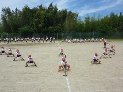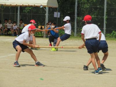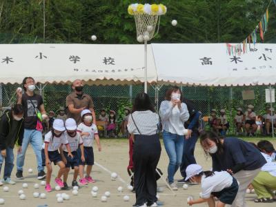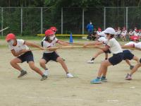 団体競技は、かわいい1年生と保護者による「玉入れ」と、4・5年生による「棒引き」でした。どちらも楽しみながらも、一生懸命に取り組めていました。