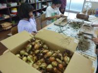 雨の合間をぬってすでに掘り出してあった玉ねぎの根切り等を行いました。段ボール箱いっぱいの玉ねぎが収穫できています。