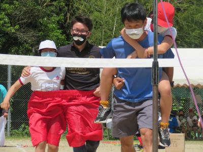 6年生は、恒例の親子競技がありました。今年は親が「ひげダンス」を踊った後、親子でデカパンやおんぶでゴールを目指します。走った後は、「親子自慢」の発表です。お互いの良いところを少し照れながらも嬉しそうに発表されていました。視線が合っているようですね。
