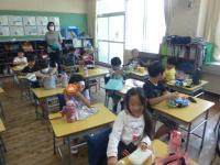 お家の方の愛情がつまったお弁当を、とてもおいしそうにほおばっていました。上の写真は、1年生の様子です。
