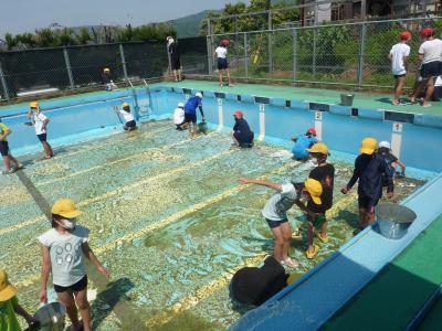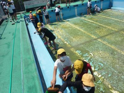 水を抜いたプールはとても汚れていて最初はどうなることかと思いました。それでも、みんなで力を合わせて少しずつきれいにしていきます。