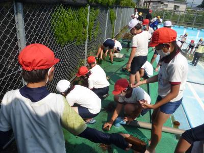 プールサイドをきれいにしてくれたのは4年生です。上学年の仲間入りをし、責任感をもって頑張ってくれました。3年生は、2時間目にプール周りの除草をしてくれました。