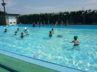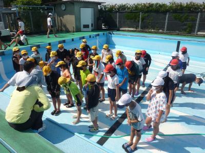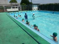 初めて大きなプールに入ります。「冷たい!」「深い」という声をあげながらも、笑顔いっぱいです。全員こわがらずに水に入ることができました。