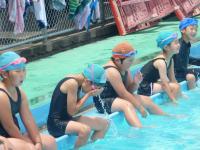 標題にもあるように、1・2年生は「水泳」ではなく「水遊び」という学習になっています。水の中で様々な遊びを楽しみながら、水を怖がることなく慣れていくことが大きな学習内容です。まずは、プールサイドでの水慣れです。