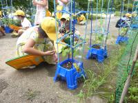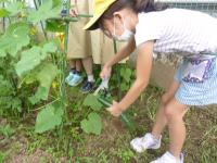 その後、きゅうりの収穫をしました。今日は6本収穫できました。2本はみんなで食べます。この後も収穫できそうですので、残りの4本と今後収穫したきゅうりは、子供たちが順番に持ち帰ります。
