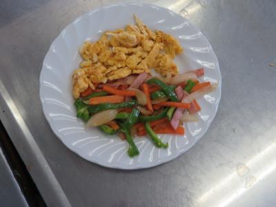 なかなかおいしそうな野菜炒めとスクランブルエッグができあがりました。自分で作った料理は自分だけで食べました。みんなで作ってみんなで食べることができず、少し寂しい実習になりましたが、この状況下、初めて調理実習ができたことでとても嬉しそうにしていた6年生でした。