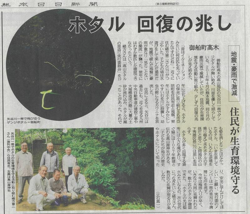 本校の校区は、熊本市に近い位置にありながら、飯田山の麓の豊かな自然に恵まれています。5月30日(日)の熊日新聞朝刊には、高山地区のホタルが、地域の方々の熱心なご努力により回復しつつあると記事となっていました。下は、その新聞記事です。