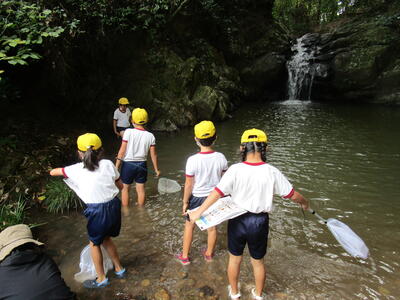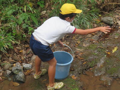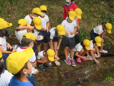 今週から少し肌寒くなってきたこともあり、はじめは「冷たい!」と言っていた子供たちですが、あちこちから「カニ見つけた!」「魚おった!」と声が上がり始めると、みんな夢中で生き物探しに取り組んでいました。
