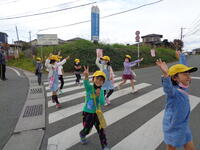笑顔いっぱいの子どもたち、今回も注意事項をしっかり守って出発です。手をあげて横断歩道を渡ることも学習です。