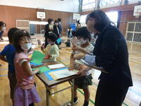 今日の学習は、お店屋さんごっこを英語で行い、色画用紙を集めることです。代表の子どもたちのお手本を見た後、二人組で練習です。先生も手伝ってくれています。