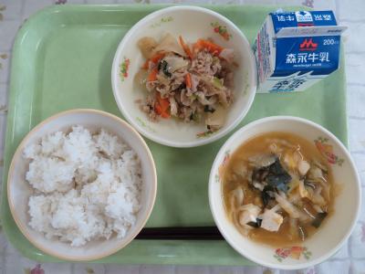 麦ごはん、きしめん汁、いわしの梅煮、野菜のおかか和え、牛乳