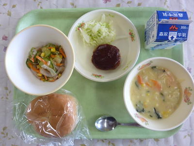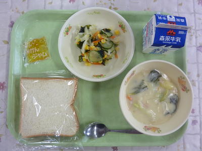 パン、鶏肉とチンゲンサイのクリーム煮、コーンサラダ、ミカンジャム、牛乳