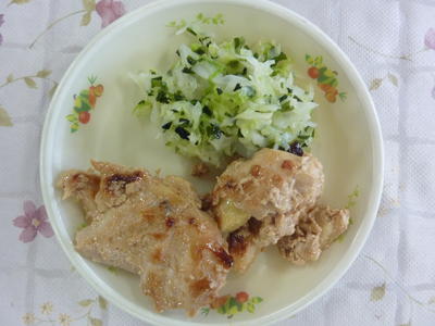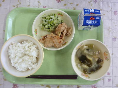 その他のメニューは、麦ごはん、茄子のみそ汁、キャベツのわかめ和え、牛乳でした。天草大王の肉は、熊本県地鶏肉活用促進の補助事業により提供されました。