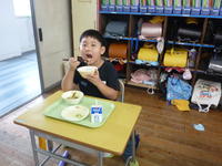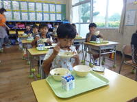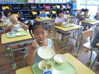 少し硬めの肉でしたが、皮の部分の脂身にうま味がたっぷりでとてもおいしかったです。写真は、1年生の様子です。口々に「おいしい」と言いながら口いっぱいに頬張っていました。