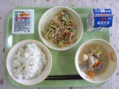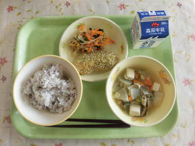 麦ごはん、さつま汁、ごぼうとナッツのカミカミサラダ、納豆、牛乳