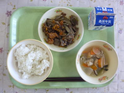 麦ごはん、しらたま汁、馬肉とごぼうの生姜煮、牛乳