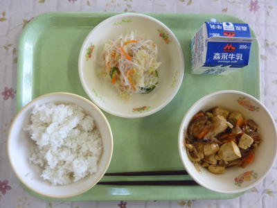 麦ごはん、カレー豆腐、春雨のごま酢和え、牛乳