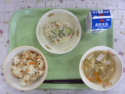 こぎつねごはん、かきたま汁、春雨のマヨネーズ和え、牛乳
