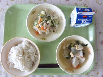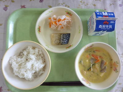 麦ごはん、豆乳みそ汁、塩サバ、大根なます、牛乳