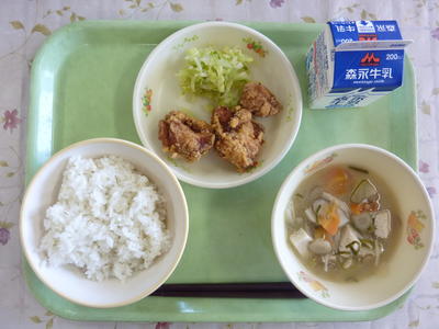 麦ごはん、味噌けんちん汁、天草大王のから揚げ、レモン和え、牛乳