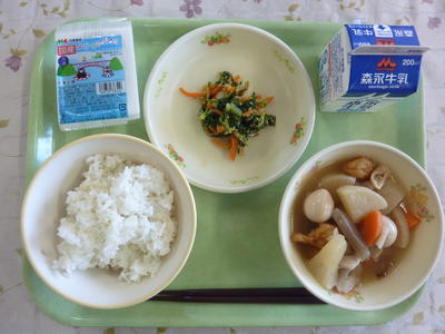 麦ごはん、だご汁、れんこんサラダ、牛乳