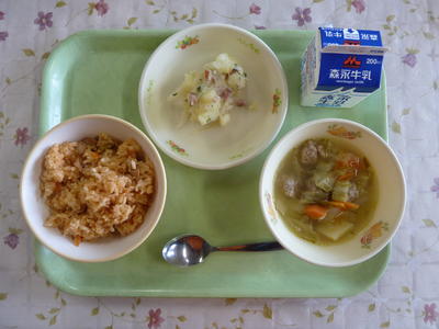 チキンライス、キャベツとミートボールのスープ、ジャーマンポテト、牛乳