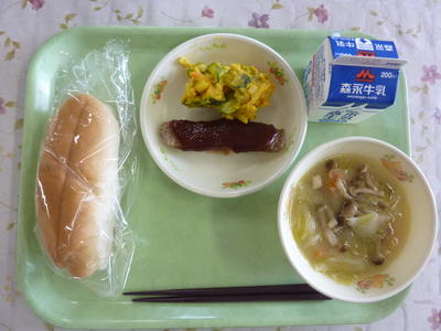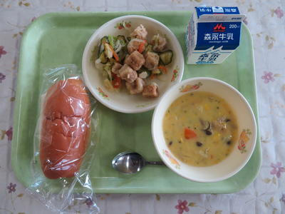 ミルクパン、南瓜のクリームスープ、甘酢サラダ、牛乳