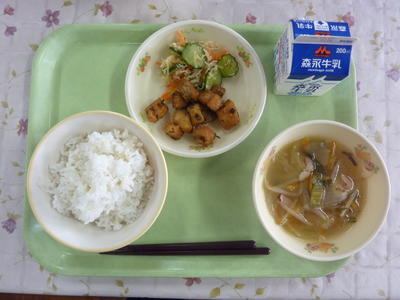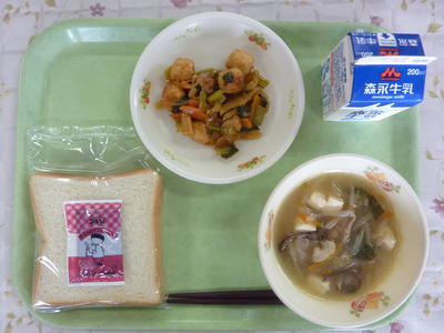 食パン、マーシャルビーンズ、チンゲン菜の中華スープ、つくねのケチャップソースがらめ、牛乳