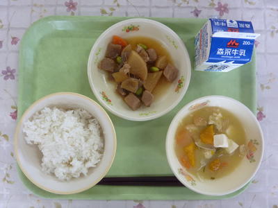 麦ごはん、かぼちゃのみそ汁、豚角煮、牛乳