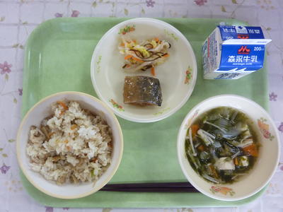 大根めし、あおさ汁、さばのごま味噌煮、昆布和え、牛乳