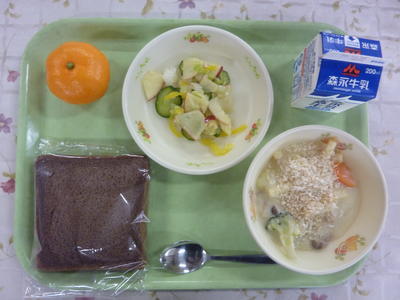 ココアパン、グラタン風シチュー、フレンチサラダ、みかん、牛乳