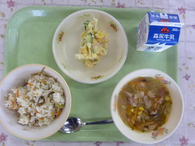 ごぼうピラフ、コンソメスープ、さつま芋サラダ、牛乳