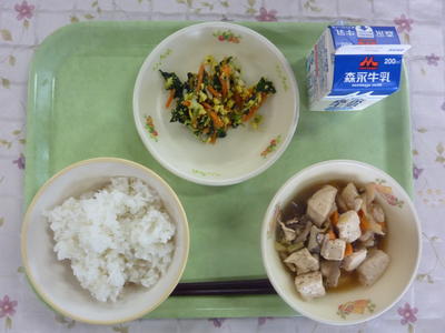 麦ごはん、肉豆腐、五色和え、牛乳