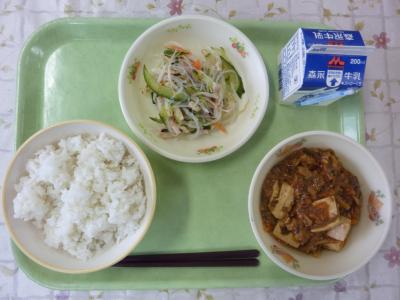 麦ごはん、麻婆豆腐、バンサンスー、牛乳