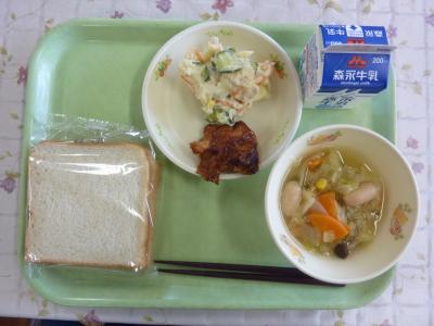 食パン、野菜スープ、バーベキューチキン、ポテトサラダ、牛乳