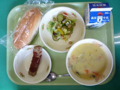 セルフドッグ、かぼちゃのクリームスープ、イタリアンサラダ、牛乳