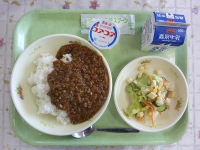 キーマカレー、シーザーサラダ、ヨーグルト、牛乳