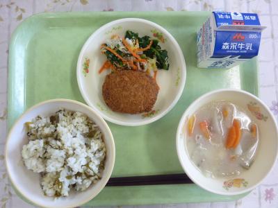 高菜ごはん、味噌だご汁、うまかコロッケ、柚子風味サラダ、牛乳