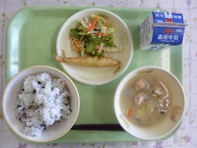 しそわかめご飯、石狩汁、ししゃもフリッター、アスパラとコーンのサラダ、牛乳
