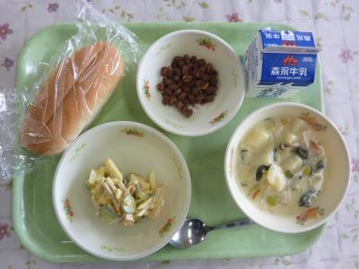 エッグサンド、小松菜のクリームスープ、大豆のチョコりんかけ、牛乳