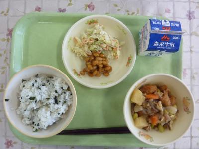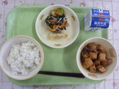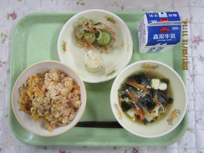 わかめご飯、じゃがいものそぼろ煮、ちりめんサラダ、ざぜん豆、牛乳