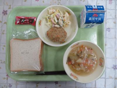 食パン、コンソメスープ、手作りハンバーグ、マカロニサラダ、牛乳