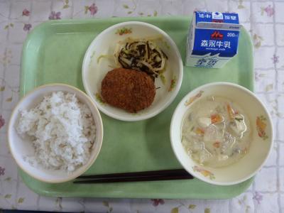 麦ご飯、豆乳味噌汁、牛肉コロッケ、野菜の昆布和え、牛乳