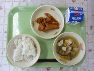 麦ごはん、チンゲン菜の中華スープ、白身魚とじゃがいものケチャップソースがらめ、牛乳